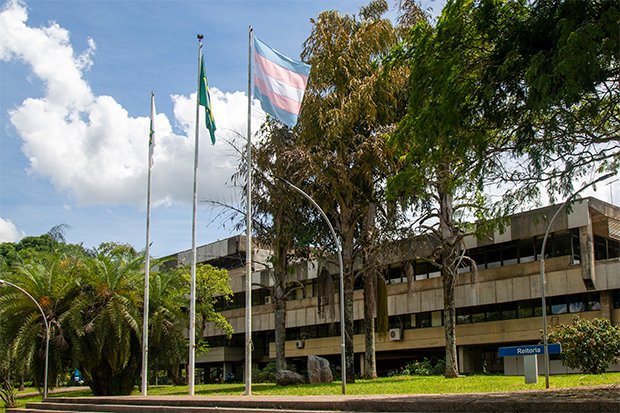 Bandeira do Orgulho Trans na Reitoria, hasteada no Dia da Visibilidade Trans. Foto: Raquel Aviani