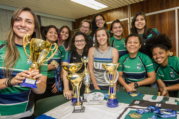 Camila Civatti (esquerda) e o time de rúgbi feminino da UnB exibem seus troféus e medalhas. Foto: Beto Monteiro. 12/07/2017