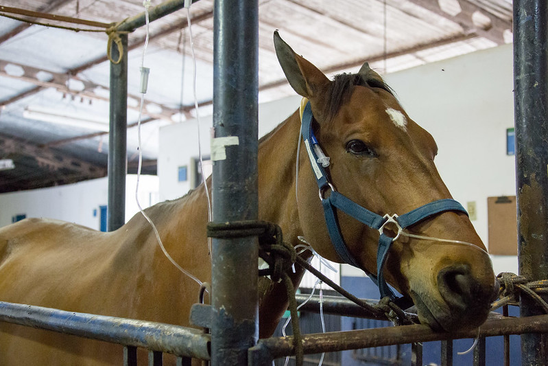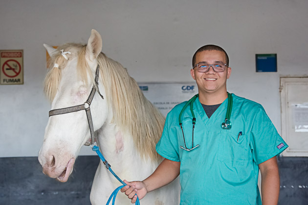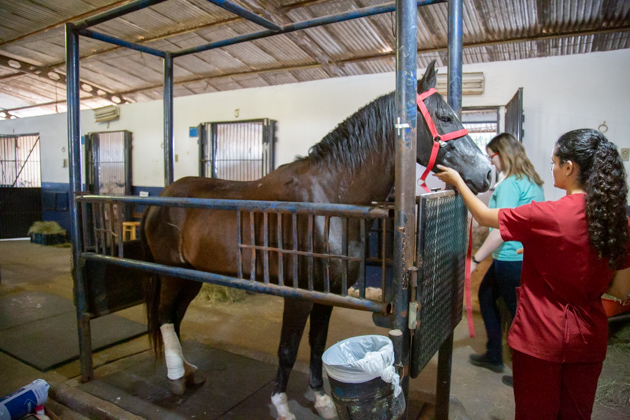 Cavalo Bino e o estudante Jhonis Sousa no Hospital-Escola Veterinário (HVet) da Universidade de Bras...